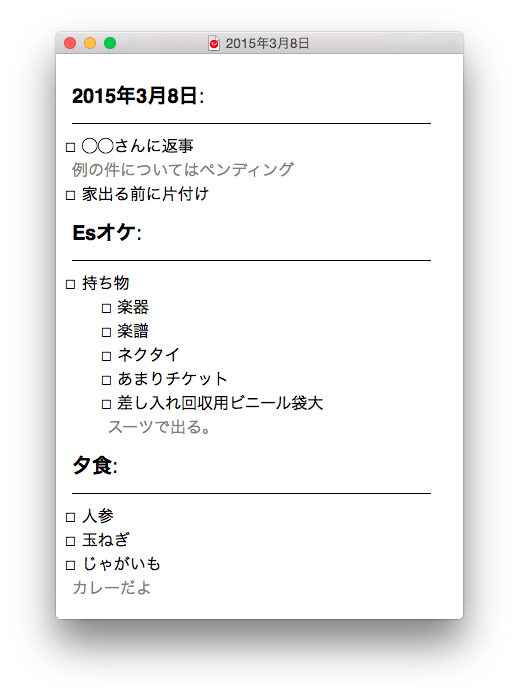 私はこれを、日付ごとに1ファイルを作っていくことで運用しています。明日のタスクは明日のファイルに、明後日のは明後日のに。そうしていくことで、余分なタスクは目に入らず、今日終わらなかった分もコピペするだけなのでとても簡単に移動できます。