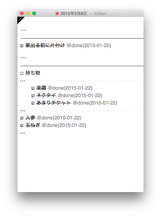 行末に「@done(日付)」という文章が自動で付加されます。TaskPaperでは、「@done」という文字列がある行を完了した行として見なします。もちろん手で@doneを書いてもOKなわけです。