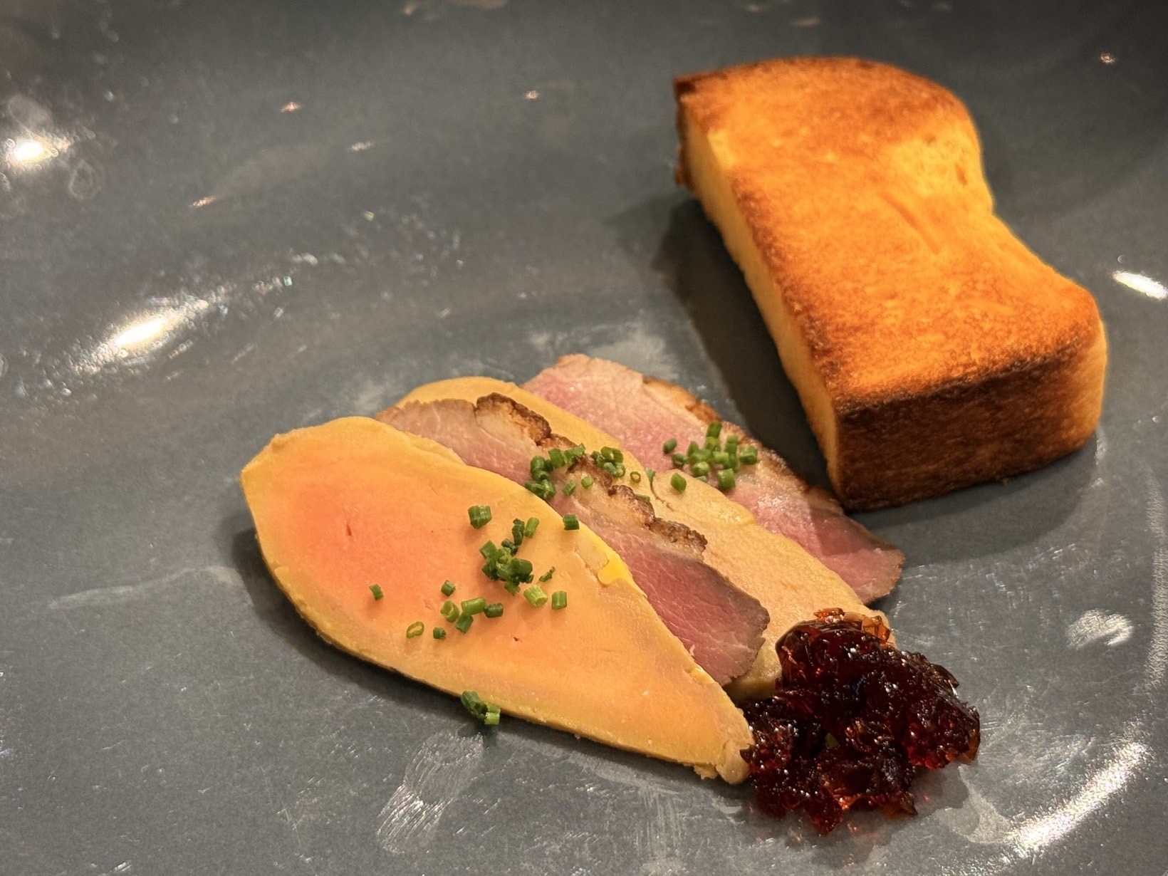 鴨肉とフォアグラ、ブリオッシュ、コンソメとポートワインのジュレ