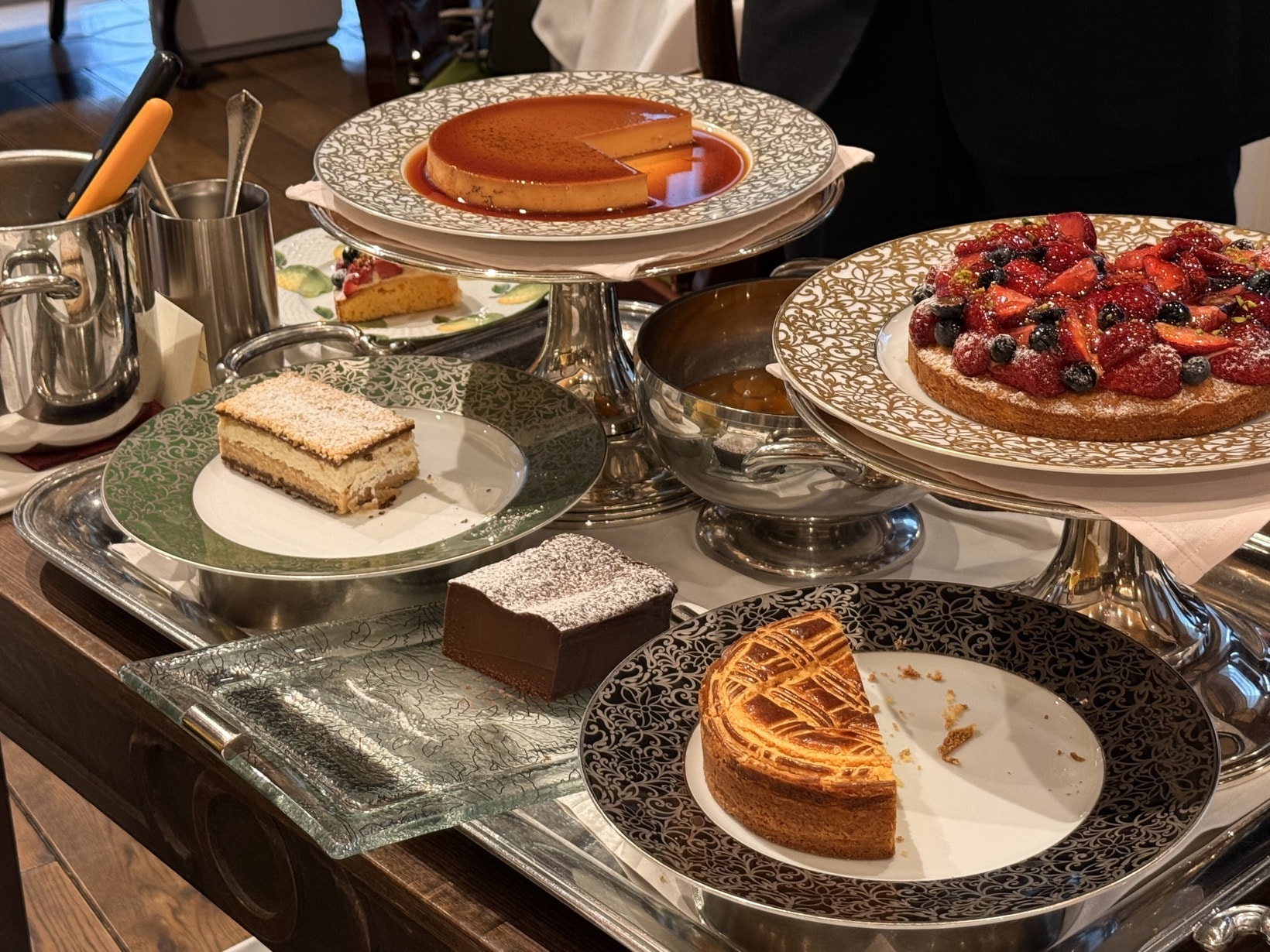 デザートはワゴンでやってくる。自分は初めて見たのではしゃいでしまった。ちょっと恐縮しながら「全種類で……」とお願いしたのだが、お客さんの 8 割が全種類を頼むそうな。カットと盛り付けもその場でやるので、大変ですねえと。