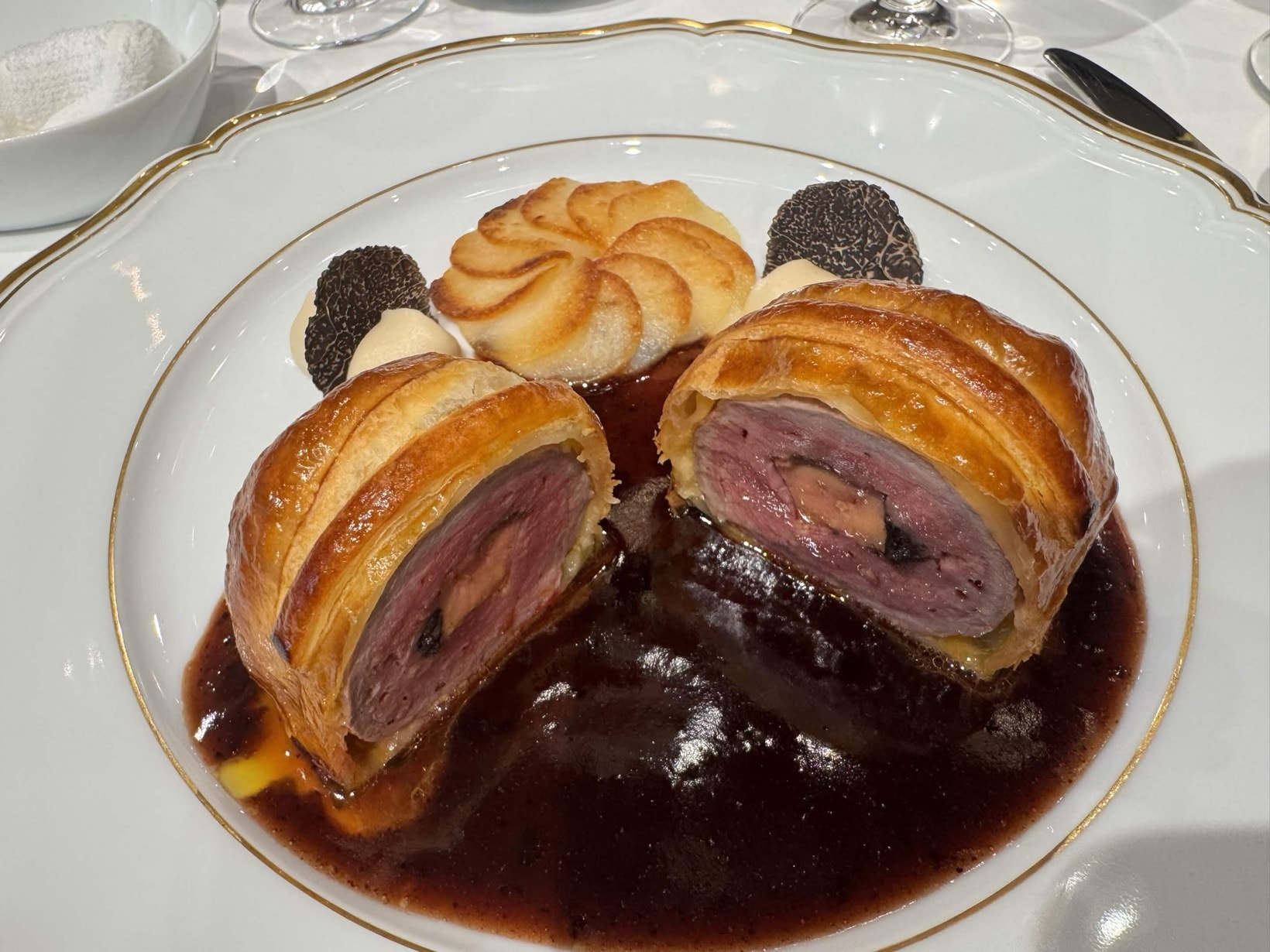 シェ・イノのスペシャリテだ。ここから断面を倒して、ナイフを入れると切りやすい。パイとお肉だけの部分でもとてつもない満足感だが、仔羊の中央にフォアグラが埋め込まれており、そこで風味が大きく変化する。見事……