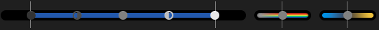 - 色の調整がドラッグのみ。iMovie も技術的には高度な色調整機能を持っていますが、数値調整はできませんし、精密にやるのは難しい作りになっています。こちらが iMovie の色調整ツールです。