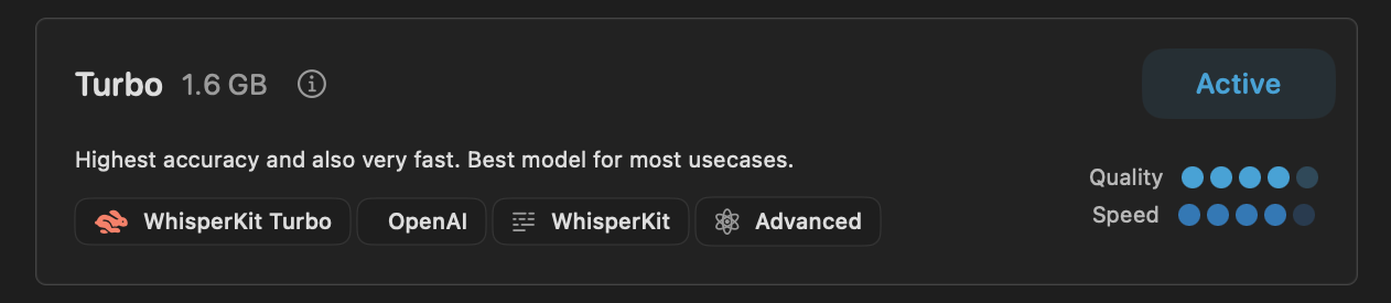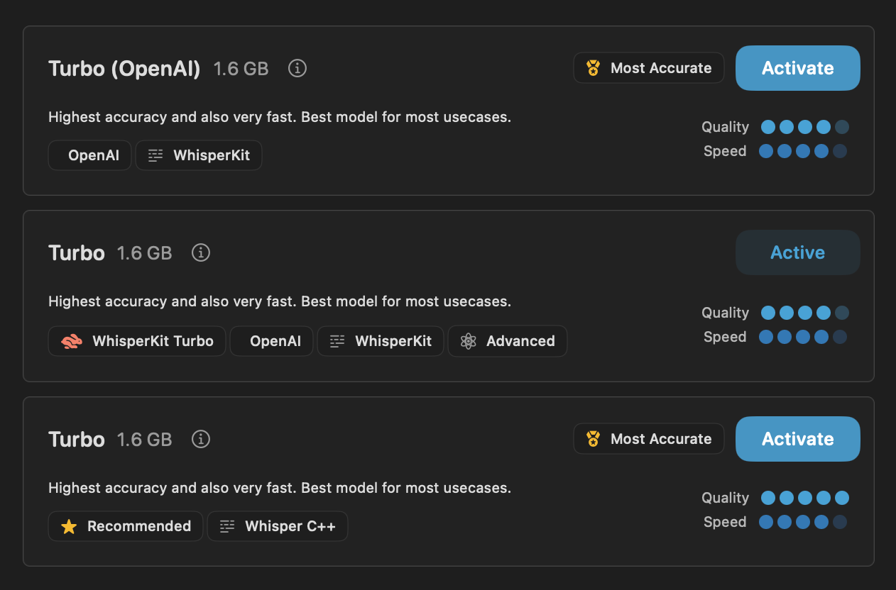 結論としては、WhisperKit Turbo タグのついた Turbo モデル が速度・品質の両面で最高の性能を発揮しました。モデル選択画面では Most Accurate タグもついていなければ Quality グラフも最良ではありませんが、日本語での利用においては別の傾向が見られるようですね。