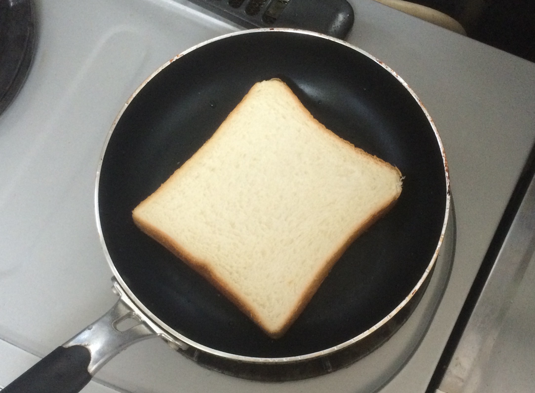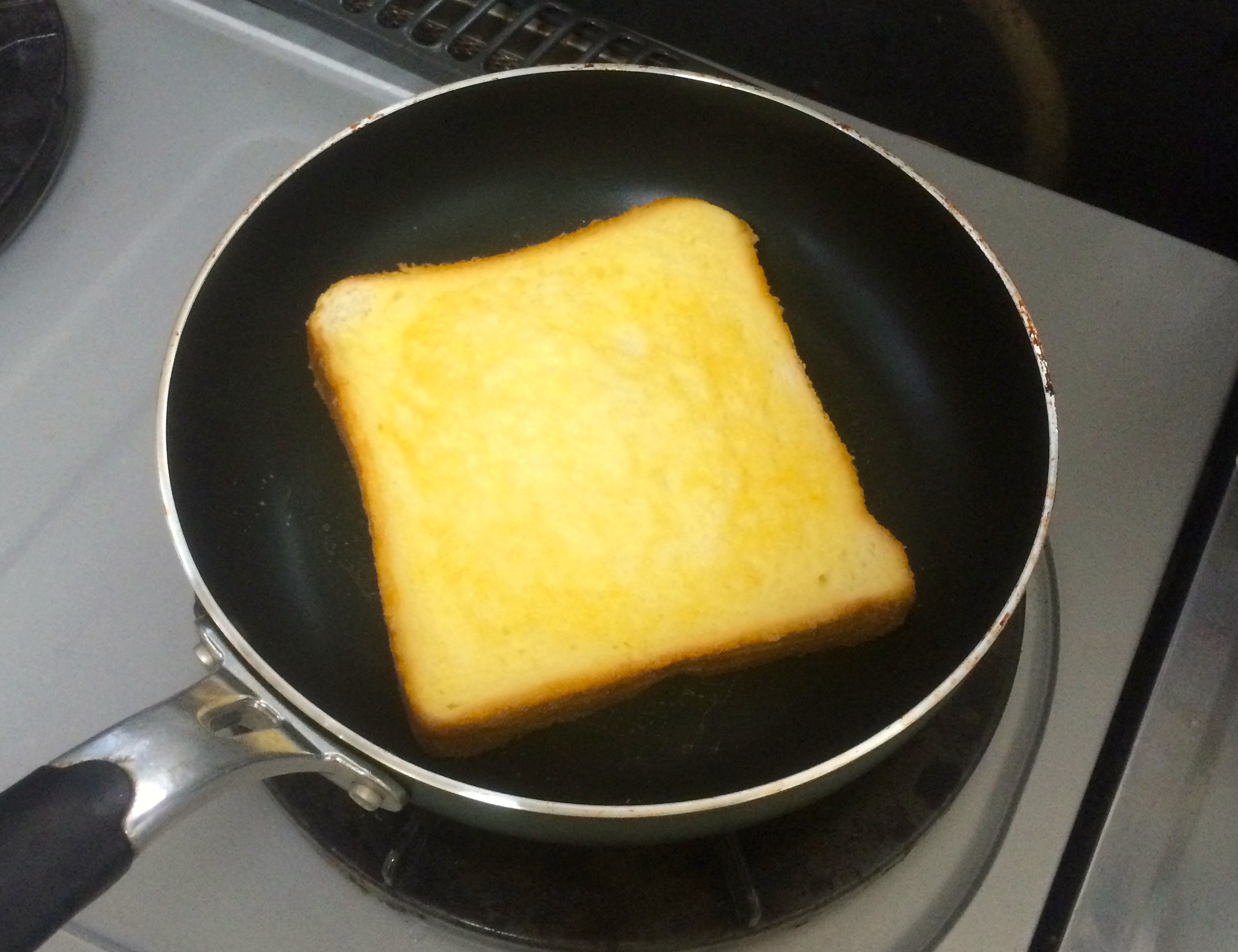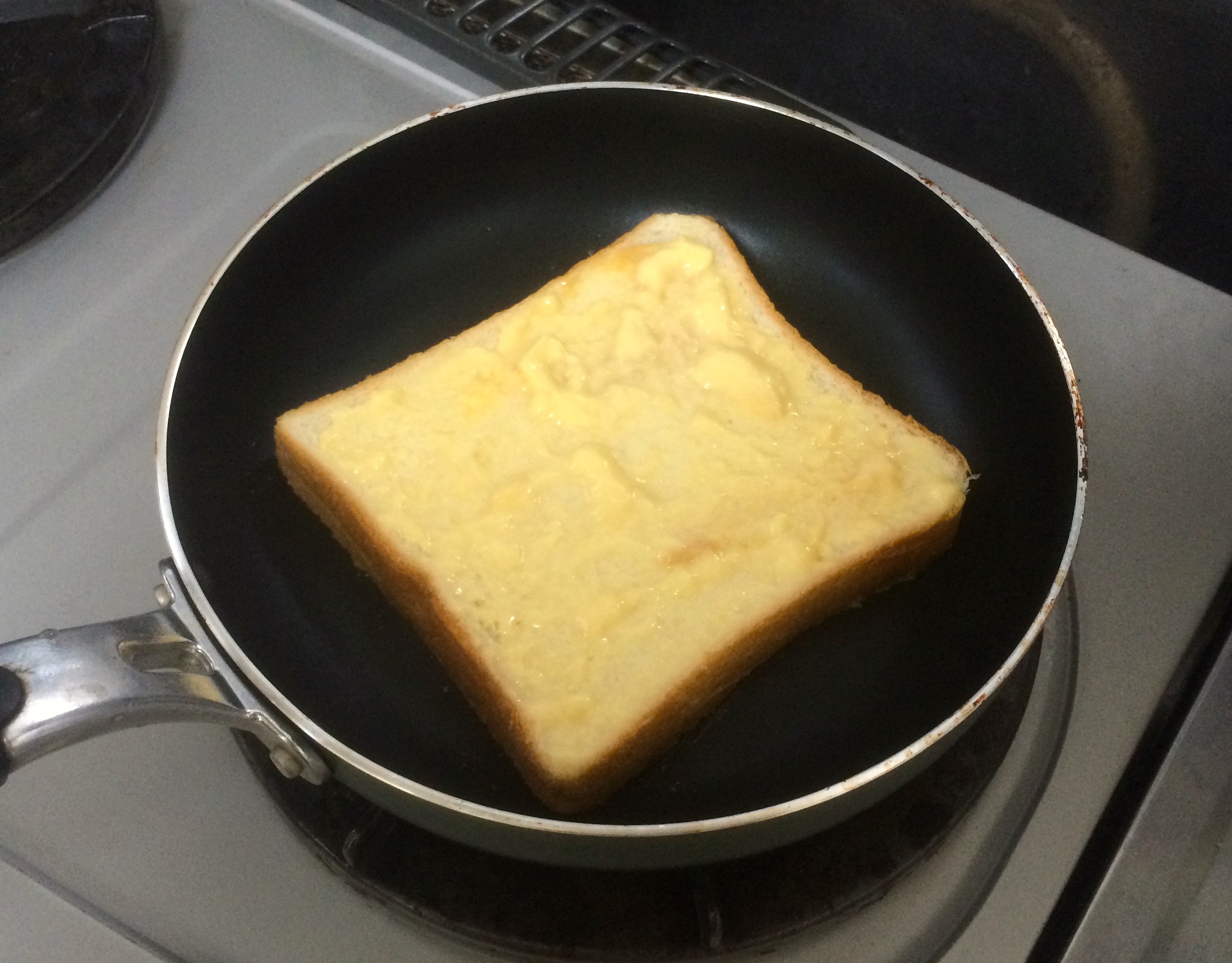 早速中火で焼きます。油もバターも敷かず、そのまんまプリンを塗った面を下に。